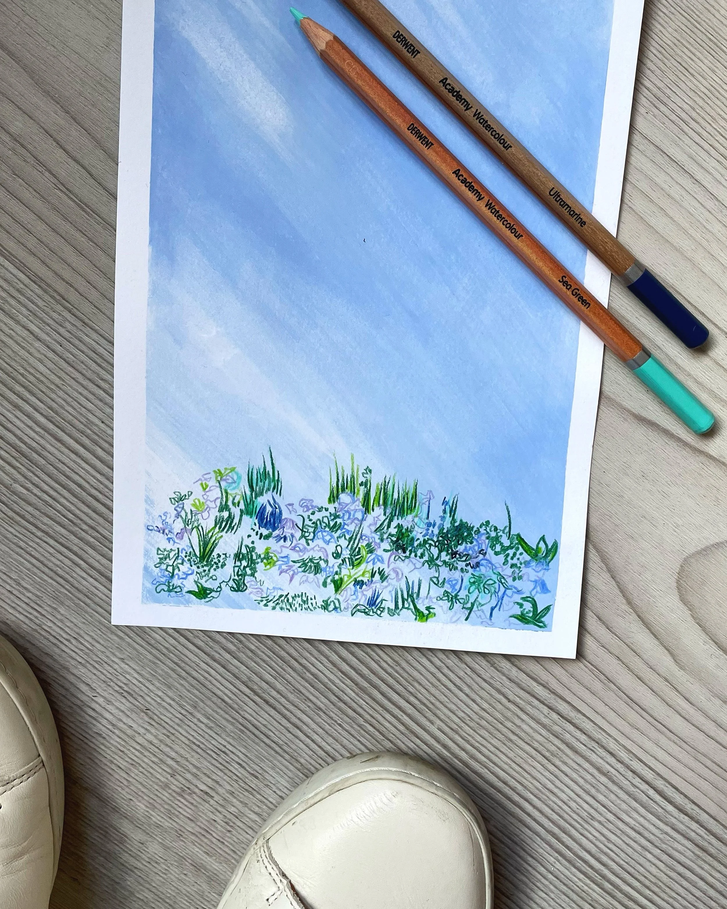 I travel fairly light with a trusty technical pencil, a rubber, a few contrasting colouring pencils and a pen as well as my sketchbook.